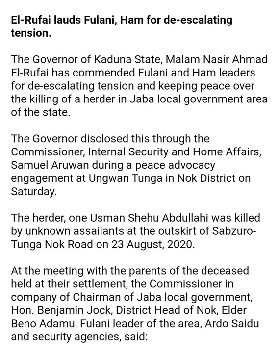 Nasir el-Rufai, governor of Kaduna, has commended Fulani and Ham leaders for de-escalating tension and keeping the peace after a herder was killed in Jaba local government area of the state.