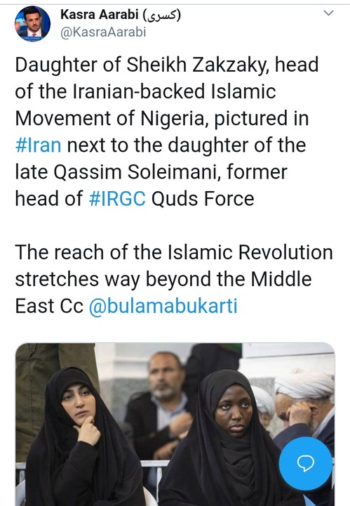 Here is the Daughter of Sheikh Zakzaky, head of the Iranian-backed Islamic Movement of Nigeria, pictured in Iran next to the daughter of the late Qassim Soleimani, former head of IRGC Quds Force