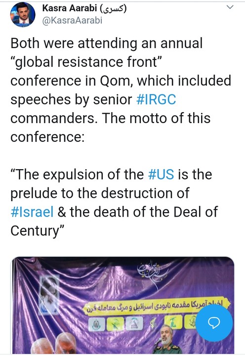 Both were attending an annual “global resistance front” conference in Qom, which included speeches by senior IRGC commanders. The motto of this conference: