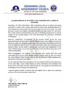 In a statement signed by the Acting Chairman of Bekwarra Local Government Area, Hon. Egbung, Odama Egbung, said he immediately contacted all security heads across the local government after the footage began circulating.