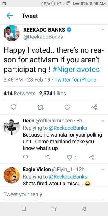 Although the twit didn’t come with a name, but we all know that Davido has been the most active celebrity on election matter, but he was not in the country do vote yesterday. Oya, let the rumble begin