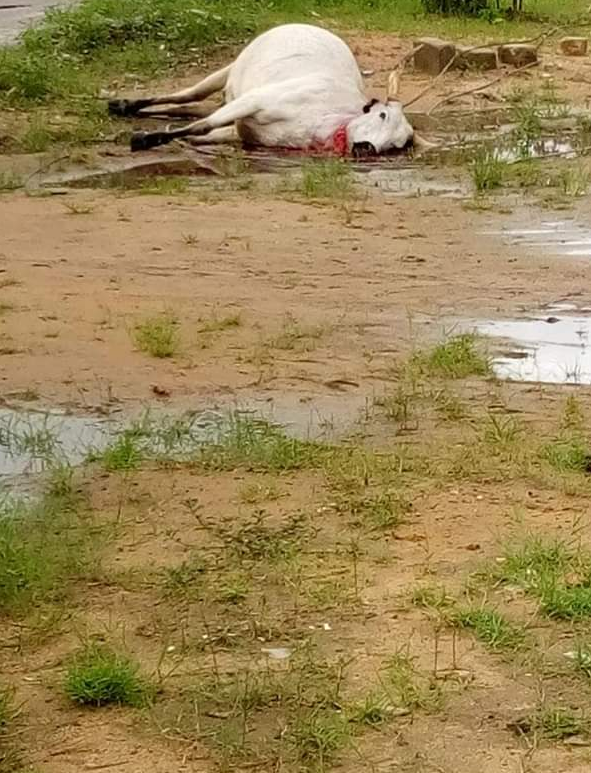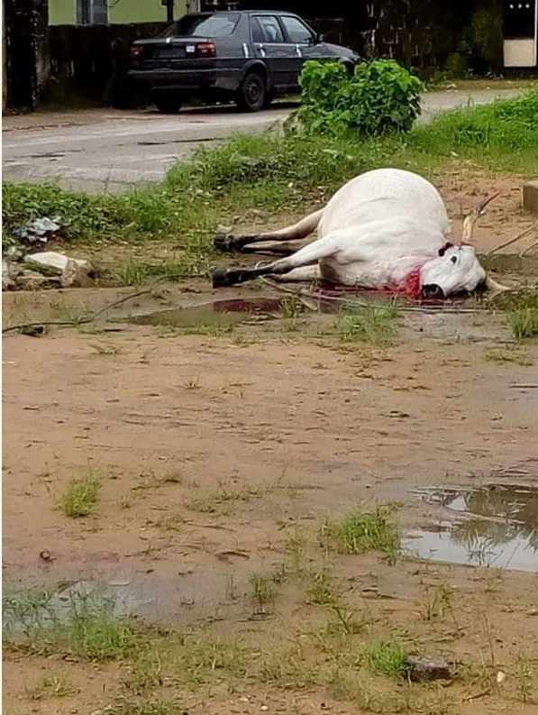 ‘Report reach us for studio say na BEDC electric wire nai kill one fat namanama cow for MTN Road close to Merit International School. According to reports, dem say the wire cut around 11:00 O’clock this morning wey rain dey fall. As the rain fall finish nai the cows dem dey pass, nai one of the nama con march the wire, na the electric nai kill am on the spot. The Fulani boy con cut the neck, make blood for commot. Na later nai BEDC switch off the lines. Na two wires cut from up. With this development, we dey warm pipo wey build stores under BEDC wire along the MTN Road especially that new store for the next compound after where this thing for happen so, and other roads for Sapele say make this serve as warning to dem. We thank God say e nor pass so. No life was loss, as na only cow nai kpuff. Na the pictures dey attached to this update so’
