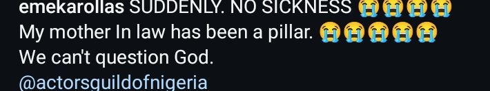 Emeka Rollas, the President of the Actors Guild of Nigeria, has been plunged into grief following the demise of his mother-in-law.