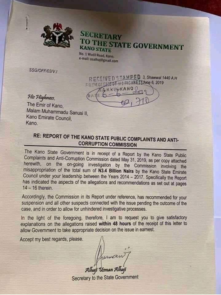 I am directed to refer to your letter No. SSG/OFF/03/V.I, dated June 6th, 2019 to which was attached a copy of the report of the Kano State Public Complaints and Anti-Corruption Chairman containing some allegations of financial misappropriation of the sum of N3.4 billion by the Kano Emirate Council.