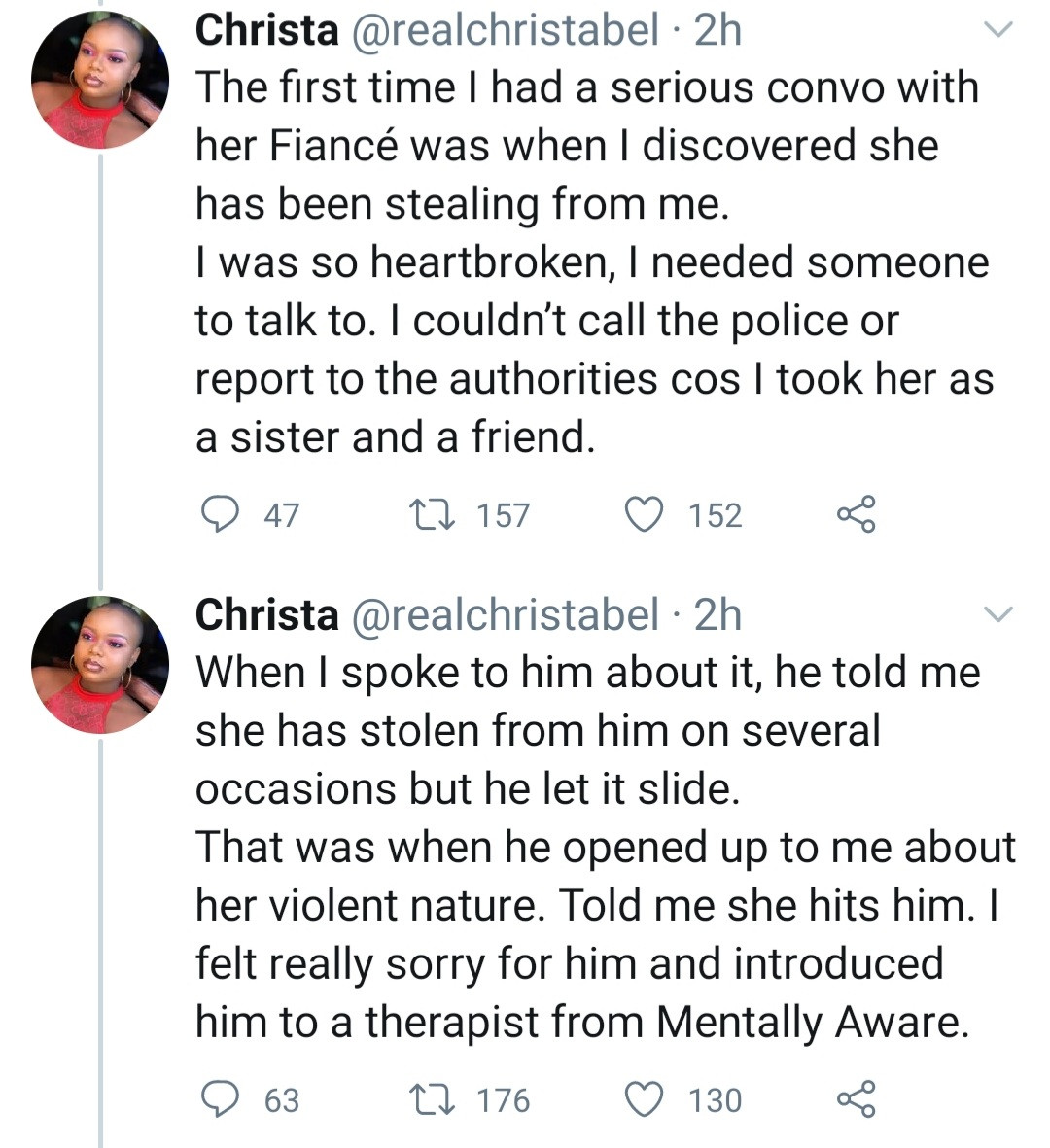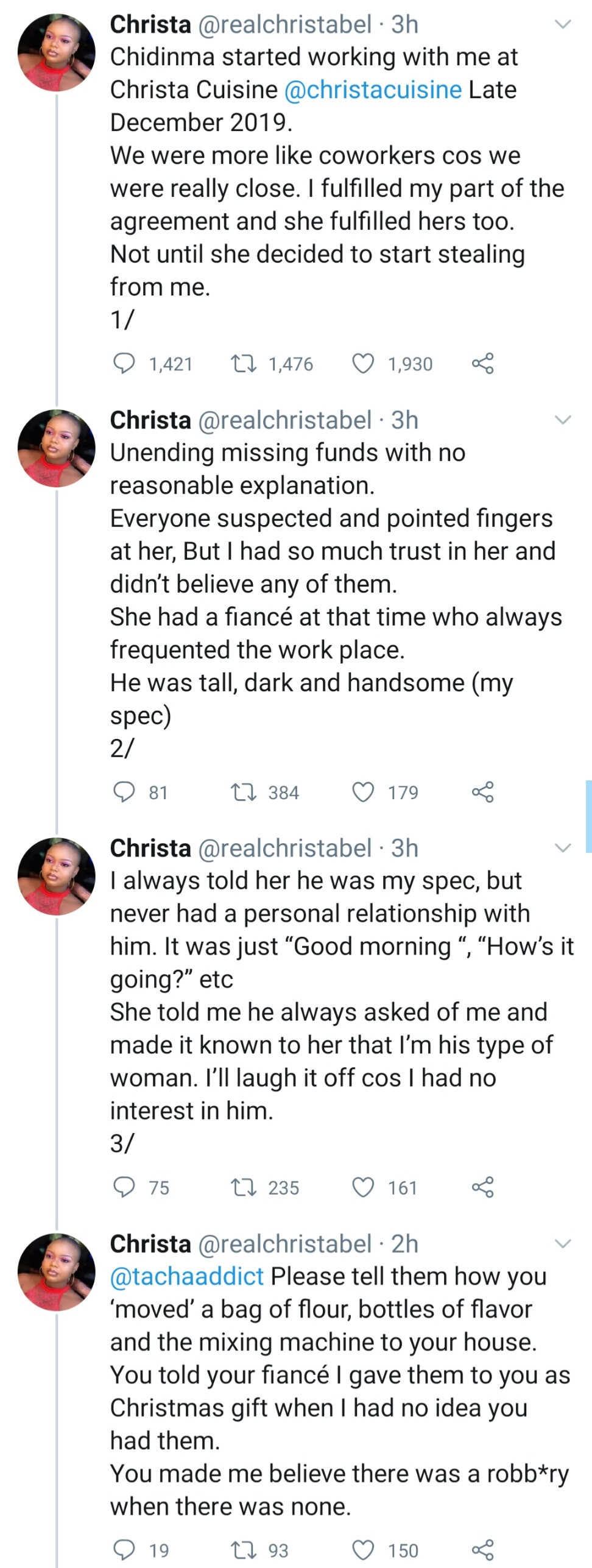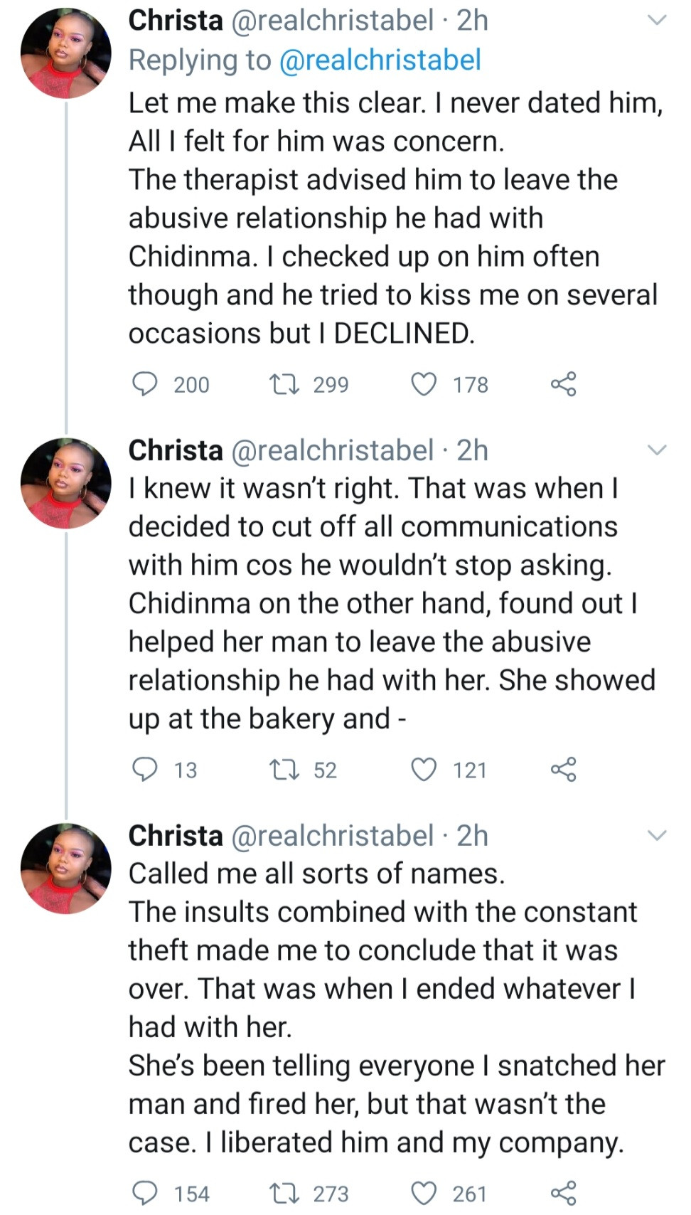 Recall that Ashley Nwosu had on Thursday alleged that she gave her all while working at Christabel’s bakery but she paid her back by snatching her fiance.