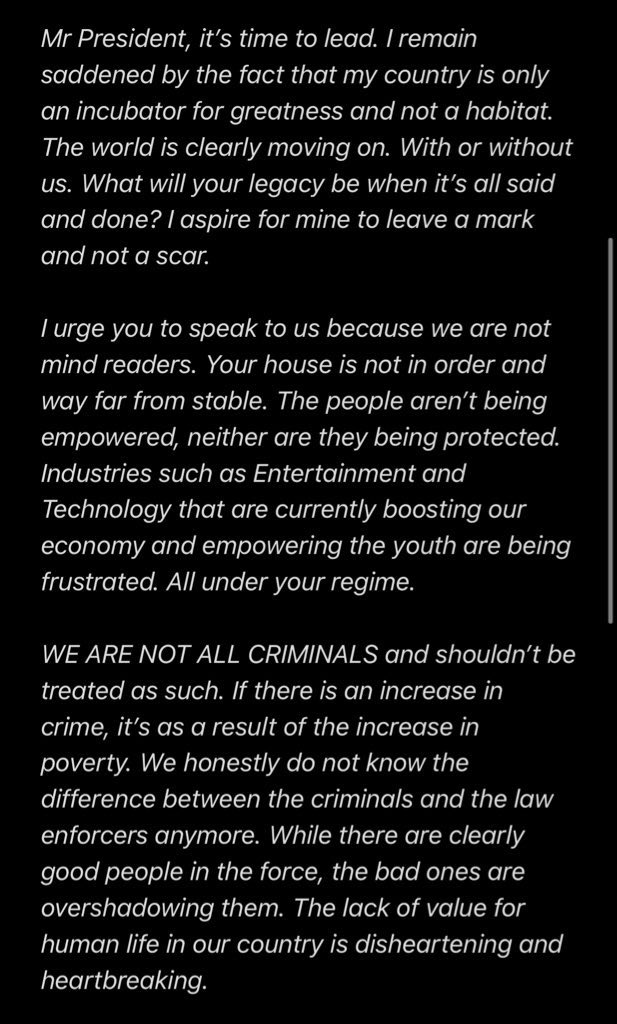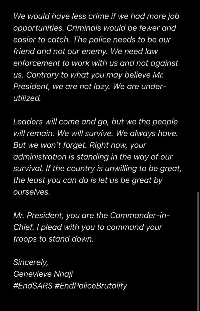 Genevieve who took to Twitter in an open letter argued that SARS operatives have become too reckless with human life and should be stopped.