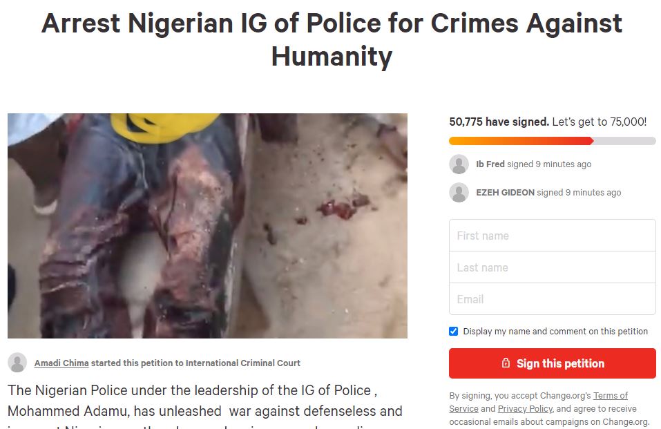 A petition for the International Criminal Court to arrest the Inspector-General of Police, Mohammed Adamu has garnered over 50,000 signatures.