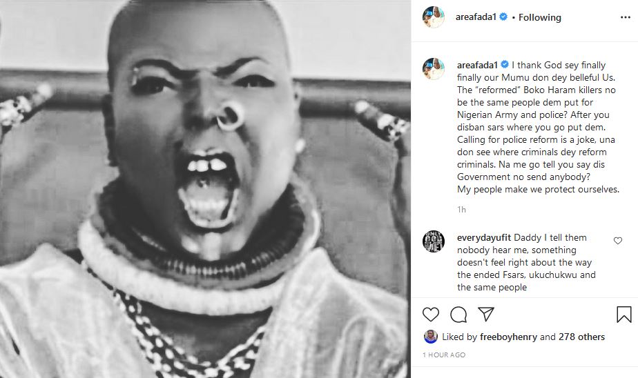 “I thank God sey finally finally our Mumu don dey belleful Us. The “reformed” Boko Haram killers no be the same people dem put for Nigerian Army and police? After you disban sars where you go put dem. Calling for police reform is a joke, una don see where criminals dey reform criminals. Na me go tell you say dis Government no send anybody?