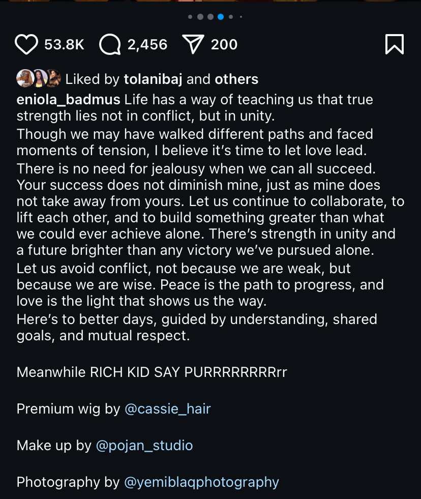 Days after the clash, Eniola has taken to her page to assert that people can still succeed hence there is no need to be jealous of anyone.