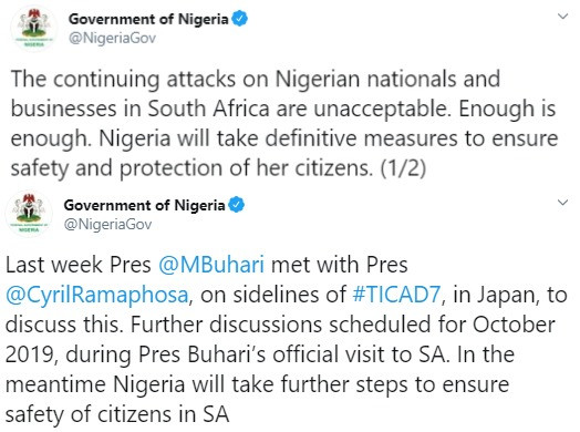 The Federal government in its reaction stated that the attacks are unacceptable and that President Buhari will meet with the South African president, Cyril Ramaphosa, in October over the rising attacks.
