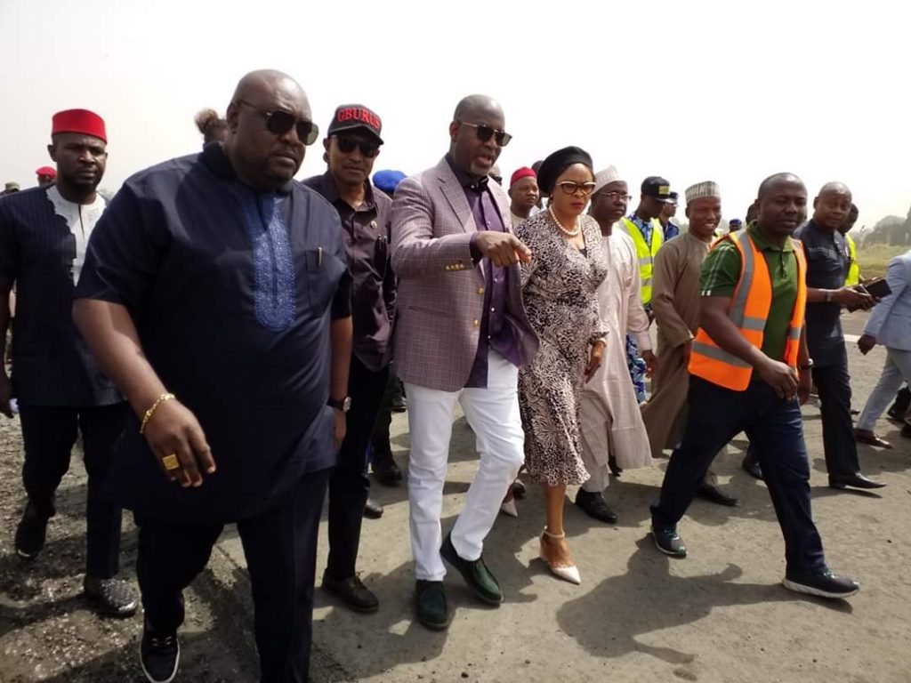 The Minister of Aviation, Senator Hadi Sirika, today inspected the ongoing rehabilitation of the runway of Akanu Ibiam International Airport, Enugu with the Enugu State Deputy Governor, Hon. Mrs. Cecilia Ezeilo, Chairman, House Committee on Aviation, Federal House of Respresentatives, Hon. Nnoli Nnaji, the Managing Director of Federal Airports Authority of Nigeria (FAAN), Captain Rabiu Yadudu, the State Commissioner for Works and Infrastructure, Engr. Greg Nnaji and the delegation from the South East Governors Forum’ Enugu Airport/Palliative Works Committee, among others.