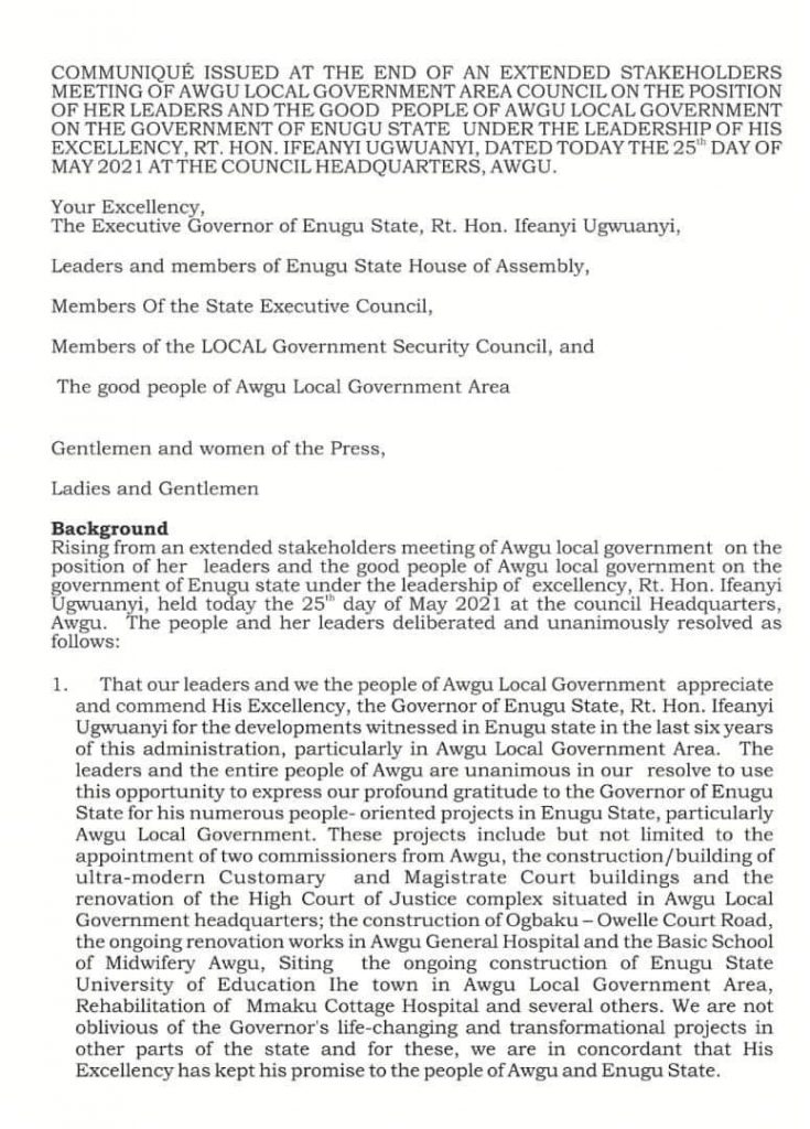 The communique read: “That our leaders and we the people of Awgu Local Government appreciate and commend His Excellency, the Governor of Enugu State, Rt. Hon. Ifeanyi Ugwuanyi for the developments witnessed in Enugu state in the last six years of this administration, particularly in Awgu Local Government Area.
