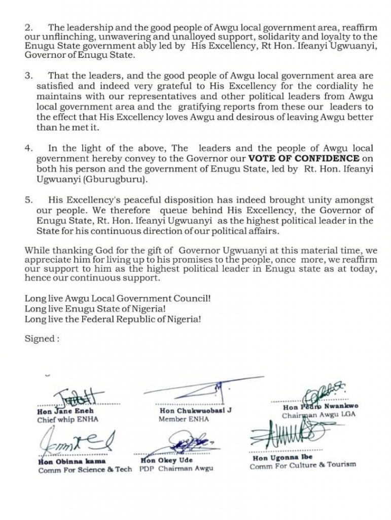 They declared that, “In the light of the above, The leaders and the people of Awgu local government hereby convey to the Governor our vote of confidence in both his person and the government of Enugu State, led by Rt. Hon. Ifeanyi Ugwuanyi (Gburugburu).