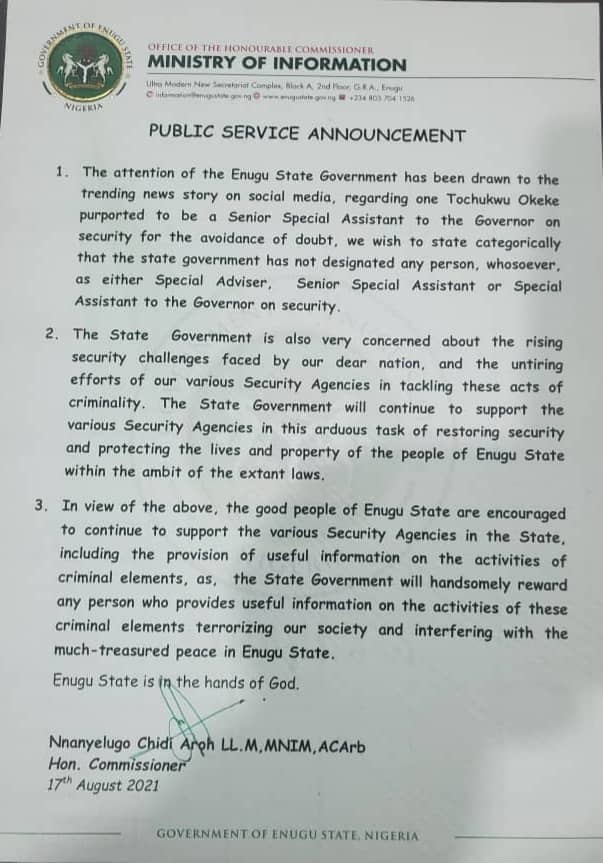 “The attention of the Enugu State Government has been drawn to the trending news story on social media, regarding one Tochukwu Okeke purported to be a Senior Special Assistant to the Governor on security for the avoidance of doubt, we wish to state categorically that the state government has not designated any person, whosoever, as either Special Adviser, Senior Special Assistant or Special Assistant to the Governor on security.