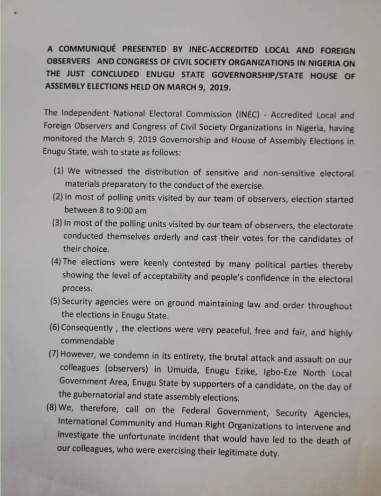 Members of the Independent National Electoral Commission (INEC)-accredited local and foreign Observers and Congress of Civil Society Organizations in Nigeria, who monitored the March 9 Governorship and House of Assembly Elections in Enugu State, have called on “the Federal Government, Securities Agencies, the International Community and Human Rights Organizations” to investigate and take action on “the brutal attack and assault on our colleagues (observers) in Umuida, Enugu Ezike, Igbo-Eze North Local Government Area, Enugu State by supporters of a candidate”.