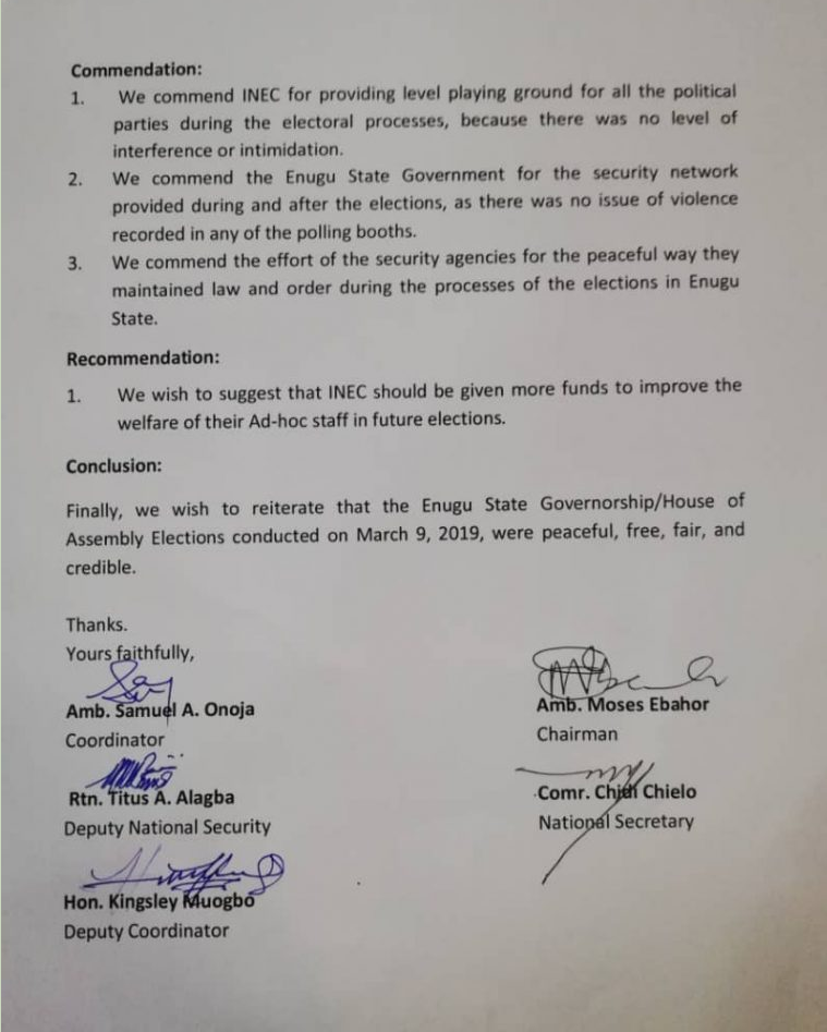 They described the governorship and state assembly elections in Enugu State as “very peaceful, free and fair, and highly commendable”, and went further to commend INEC, security agencies and the state government for providing a level playing ground and security “during and after the elections, as there was no issue of violence recorded in any of the polling booths”.
