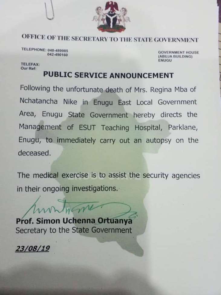 The Enugu State Government has ordered full autopsy on the body of Mrs. Regina Mba, the middle-aged woman who was allegedly killed in Nchatancha area of the state, Igbere TV reports.