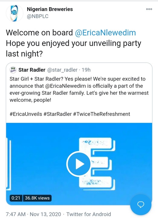 Erica Signs Star Radler And Legend Stout Endorsement Deals - 9jaflaver