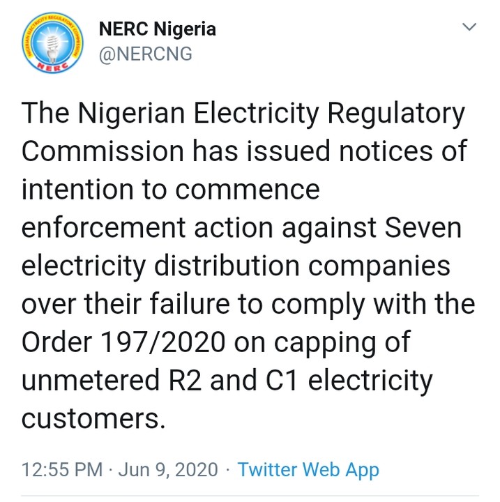 The Nigerian Electricity Regulatory Commission has issued notices of intention to commence enforcement action against Seven electricity distribution companies over their failure to comply with the Order 197/2020 on capping of unmetered R2 and C1 electricity customers.