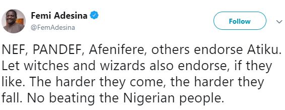 Femi Adesina, presidential spokesman, says Atiku Abubakar, presidential candidate of the Peoples Democratic Party (PDP), will not win the election even if witches and wizards endorse him. Adesina said this in reaction to the endorsement of Abubakar by five socio-cultural groups in the country. Writing via his Twitter handle on Monday, he said President Muhammadu Buhari’s opponents will fail during the elections, no matter whose endorsement they get. “NEF, PANDEF, Afenifere, others endorse Atiku. Let witches and wizards also endorse, if they like. The harder they come, the harder they fail. No beating the Nigerian people,” he tweeted.