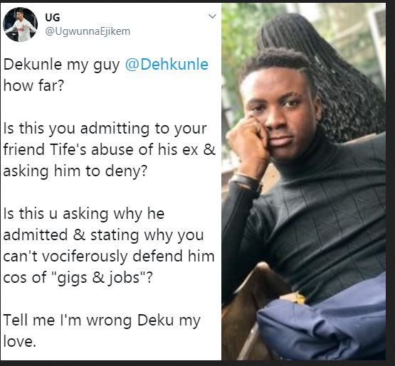 In the voice note released by Ugwunna Ejikem who claims he’s a medical doctor, Dehkunle is heard expressing outrage after Tife took to Twitter to admit and apologize after his ex accused him of rape among other things.