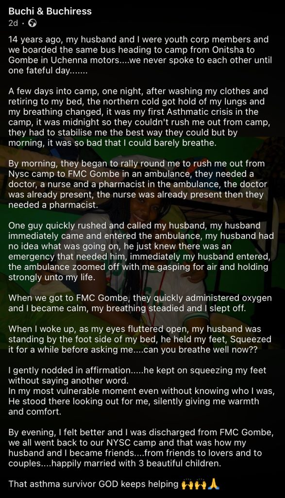 The couple returned to their NYSC camp, where their bond grew from friendship to love, eventually leading to marriage and three children.