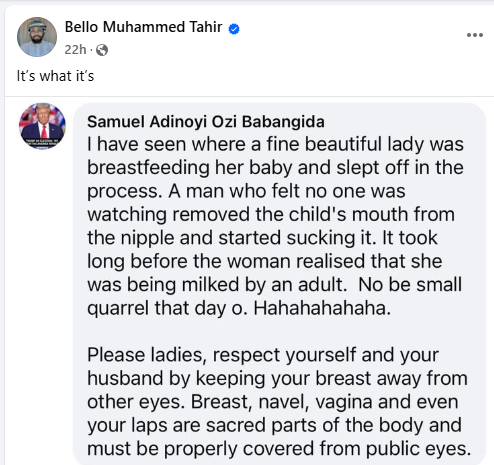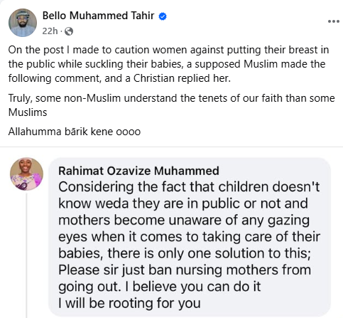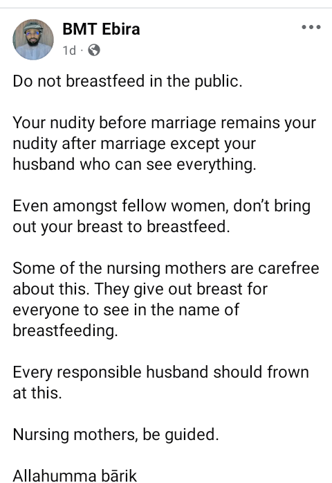 “Some of the nursing mothers are carefree about this. They give out breast for everyone to see in the name of breastfeeding. Every responsible husband should frown at this. Nursing mothers, be guided. Allahumma bārik.”