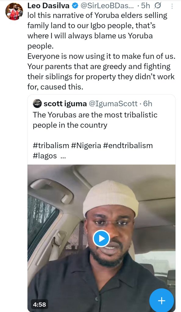 Dasilva wrote on X: “lol this narrative of Yoruba elders selling family land to our Igbo people, that’s where I will always blame us Yoruba people.