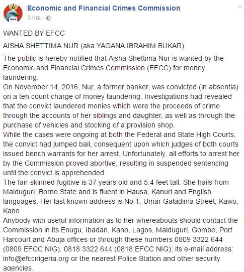 The public is hereby notified that Aisha Shettima Nur is wanted by the Economic and Financial Crimes Commission (EFCC) for money laundering.