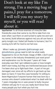 He added: “When I wake up, MNET TV, Africa Magic, and MultiChoice Group need to tell me what really happened to me on the finale/stage of BBA.”