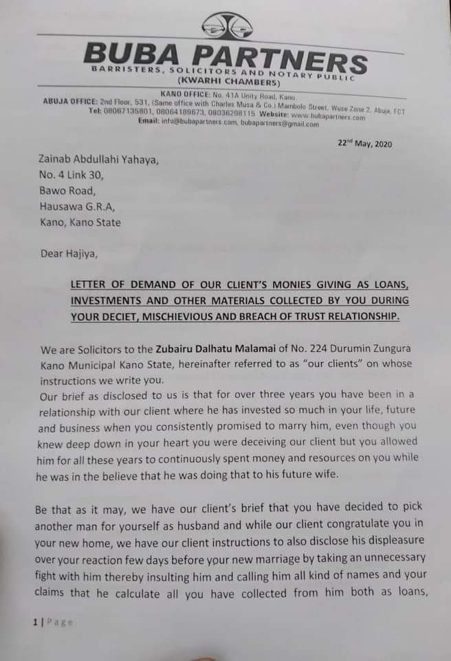 According to the court papers making the rounds on social media, the man identified as Zubairu Malhamatu Malamai, accused Zainab of lying to him while they allegedly dated for three years. According to Zubairu, he invested over N9 million on Zainab who promised to get married to him but ended up with somebody else.