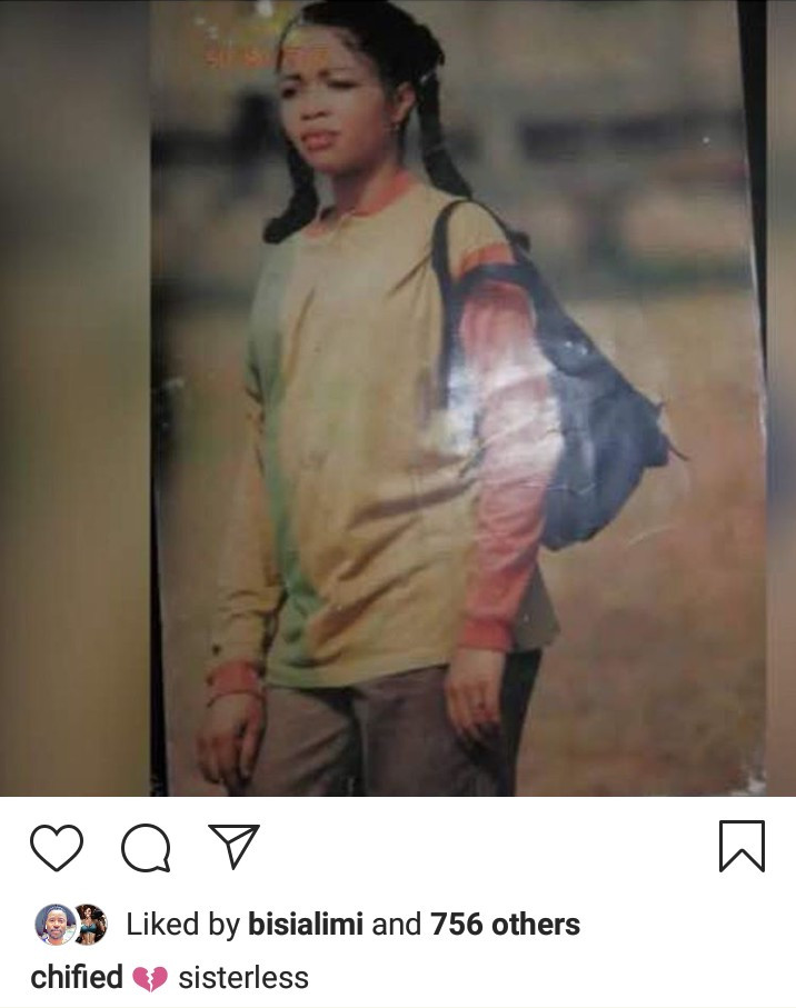 The retired Danish Nigerian footballer took to Instagram to share a photo of her late sister with the caption, “sisterless” and a broken heart emoji.