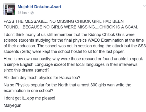 Leader of the Niger Delta People’s Volunteer Front, Alhaji Mujahid Asari Dokubo, released a statement via his Facebook page, insisting that the no schoolgirl was kidnapped from Chibok and the news of girls being rescued is a scam…see what he wrote after the cut…
