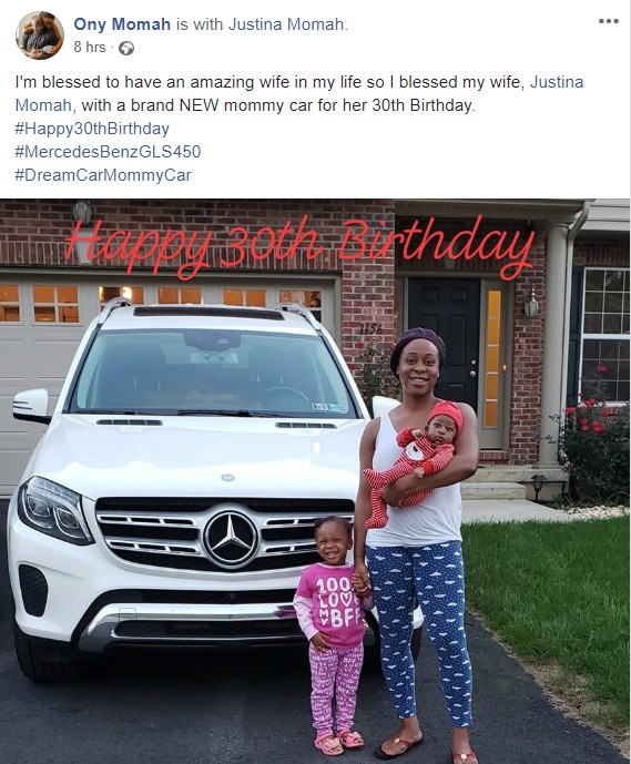 “I’m blessed to have an amazing wife in my life so I blessed my wife, Justina Momah, with a brand NEW mommy car for her 30th Birthday.