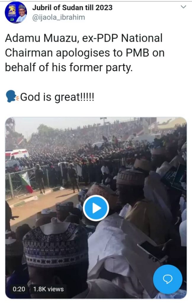 Now Ijaola Ibrahim has shared video of Adamu Muazu, ex-PDP National Chairman apologizing to President Muhammadu Buhari on behalf of his former party, PDP.