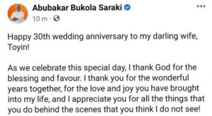 “Ex-Senate President, Bukola Saraki has taken to his social media page to celebrate 30th wedding anniversay with his wife, Toyin.