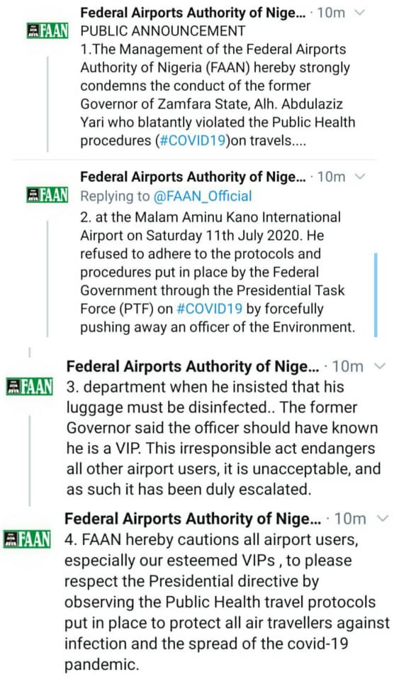 “The Management of the Federal Airports Authority of Nigeria (FAAN) hereby strongly condemns the conduct of the former Governor of Zamfara State, Alh. Abdulaziz Yari who blatantly violated the Public Health procedures (COVID19) on travels at the Malam Aminu Kano International Airport on Saturday 11th July 2020.