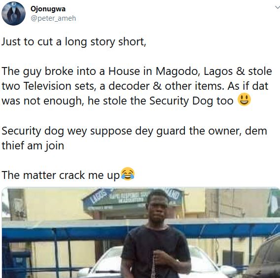 He tweeted; “Just to cut a long story short, The guy broke into a House in Magodo, Lagos & stole two Television sets, a decoder & other items. As if dat was not enough, he stole the Security Dog too
