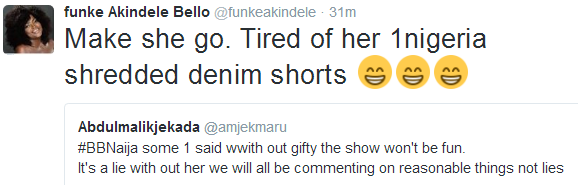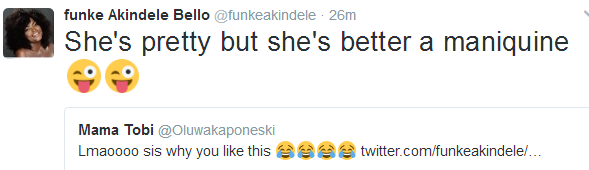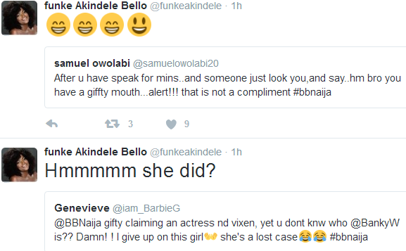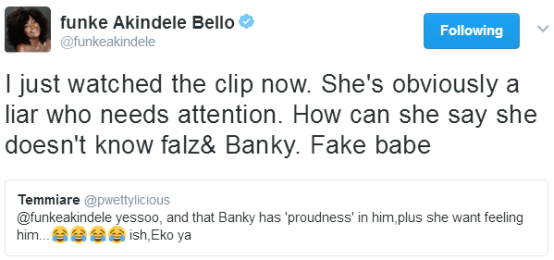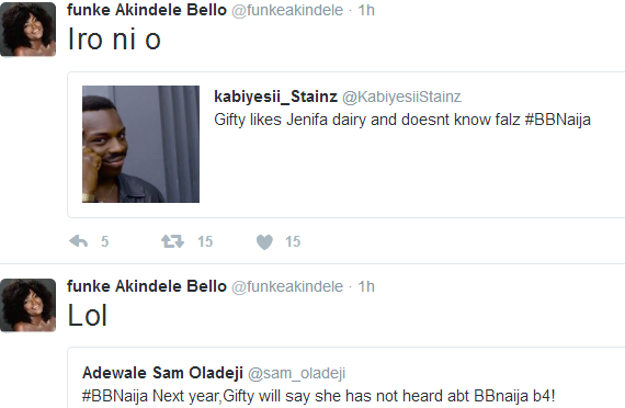 Actress Funke Akindele this morning mocked BBNaija housemate, Gifty, who yesterday said she doesn’t know singers Falz and Banky W. Both artistes had paid a visit to the Big Brother House in South Africa this week and Gifty claimed not to know them. See all of Funke’s tweets below