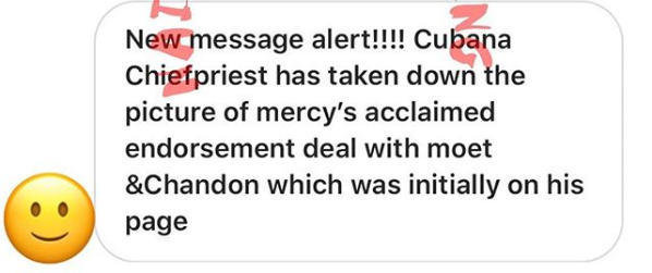 Moët & Hennessy influencer, Cubana chief priestjust takes down the Mercy’s endorsement photo from Moët he uploaded on his page…