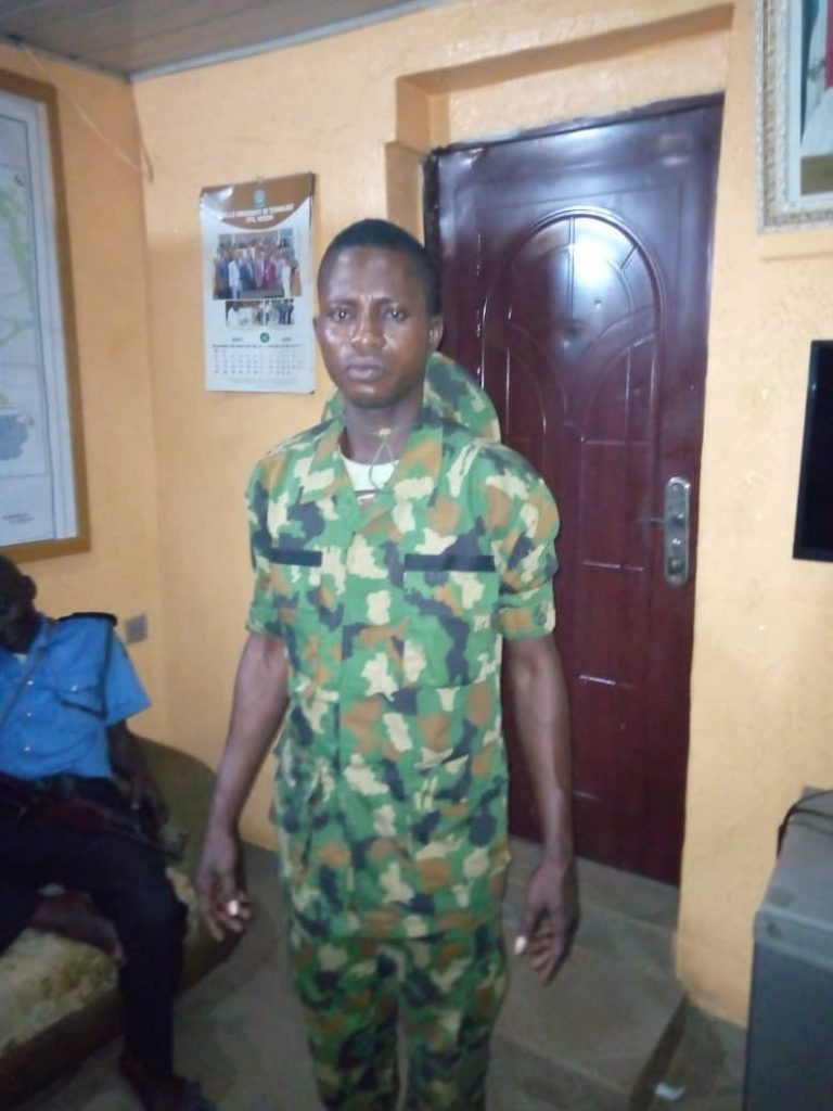 A statement released by DSP Abimbola Oyeyemi, spokesperson of the state police command, says the suspect was arrested on September 8 when he came to Sango Ota divisional headquarters fully dressed in army camouflage uniform to solicit for the release of a suspect.