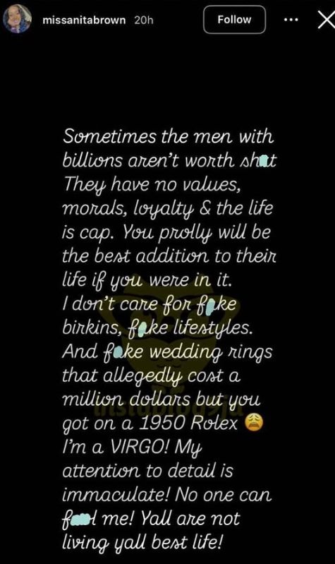 In a lengthy Instagram post, Anita Brown criticized billionaires who live fake lives, flaunting luxury items including fake Birkins and expensive wedding rings.