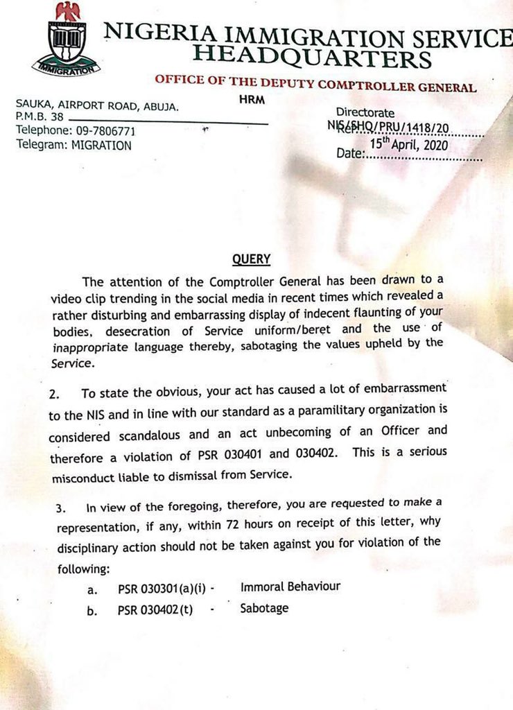 The Nigeria Immigration Service has queried its officers, who appeared in a viral music video challenge, threatening to take severe actions against them as punishment.