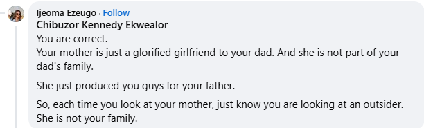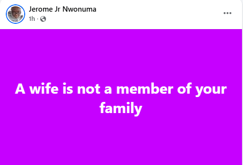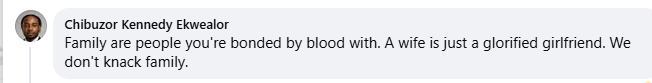A Facebook user, Chibuzor Kennedy Ekwealor, has said that a wife is not a man’s family member but a “glorified girlfriend.”