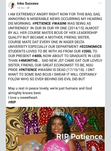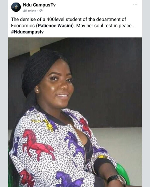 BLACK DAY ! BLACK DAY !! SAD NEWS“Am in a sad mood, we lost a frd, Patience Wasini when i had of your death i couldn’t believe that truely you are gone and gone forever, we will greatly Miss you, your family & frds will indeed Miss you, we love & cherish you but God loves you more, we can’t just question authority why ? He give and taketh, goodbye till we see and parth no more, goodnight,RIP ********RIP *******RIP*******”
