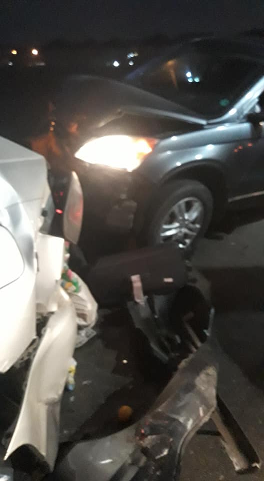 While talking with the policemen at the checkpoint, a speeding vehicle rammed into their car from behind and wrecked havoc.