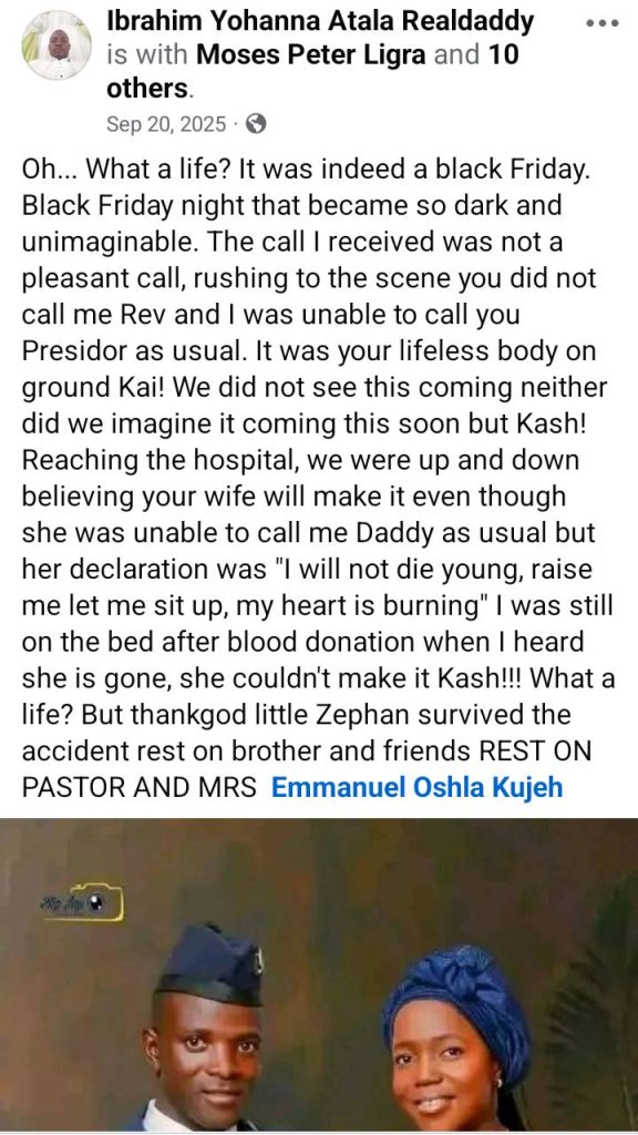 His parents, pastor Emmanuel Oshla Kujeh and Charity, d!ed in the crash that occurred in Lafia, Nasarawa State on September 19, 2025.