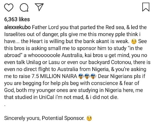 Nollywood actor, Alex Ekubo, took to Instagram to share an email he received from a fan asking him to help in raising N7.5m for his education in Australia.