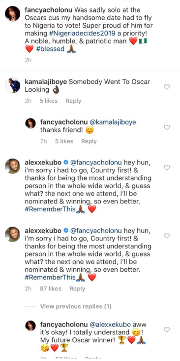 Model Fancy Acholonu has called her man Alex Ekubo a patriotic man after he skipped going for the Oscars with her so he can return to Nigeria and perform his civic duty.