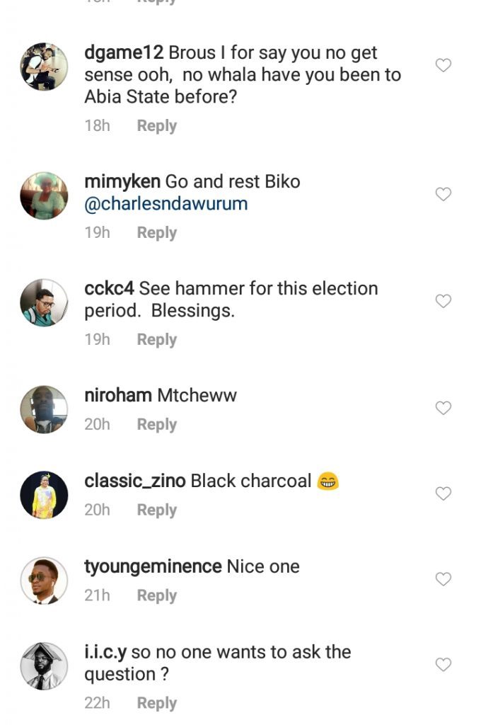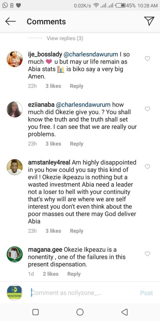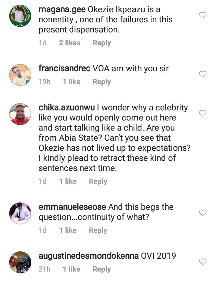 But Fan took to his comment section to attack him for showing support and asking them to vote, Governor, Okezie Ikpeazu